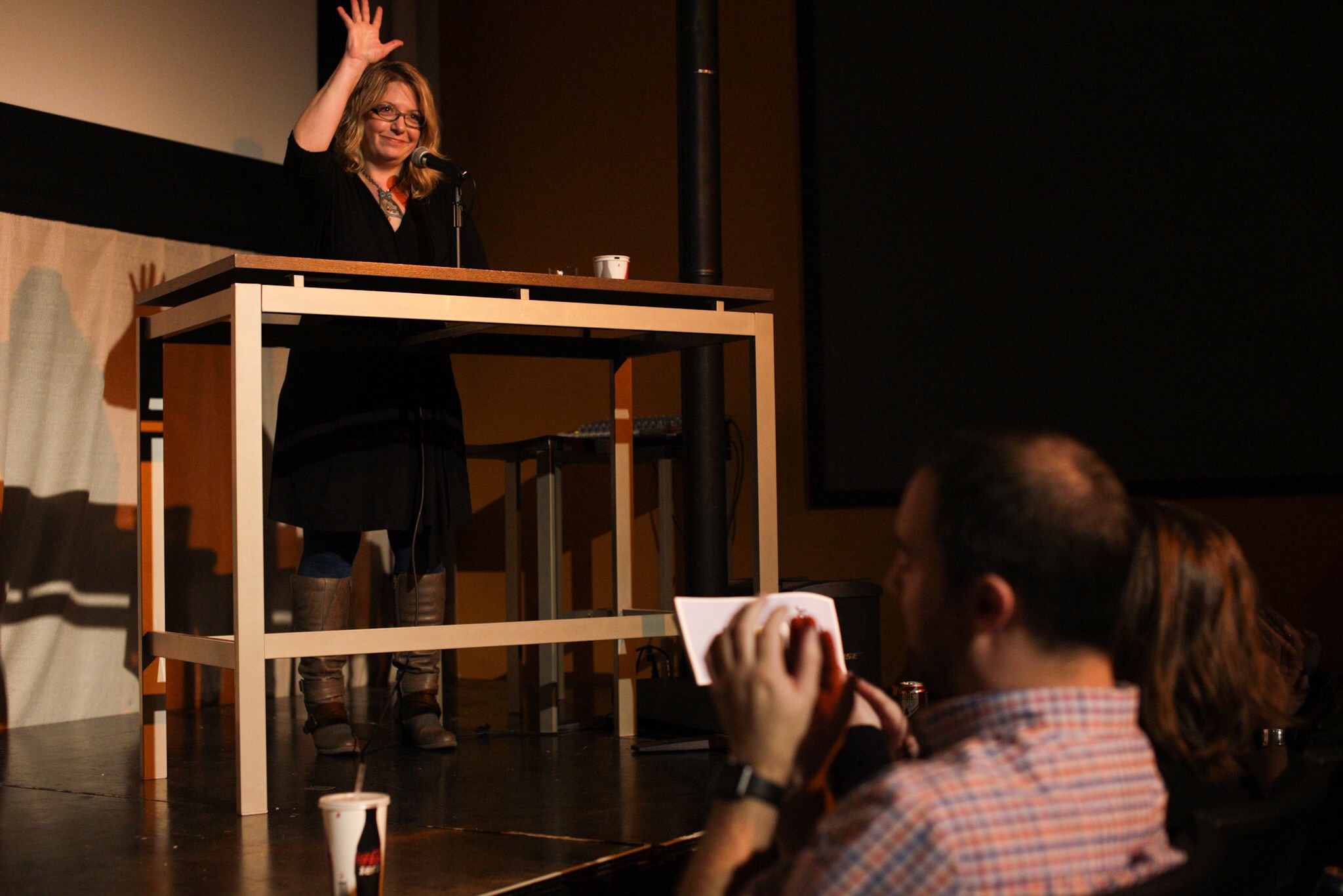In the theater on Thursday, an audio visualizer played on the big screen in ever changing colors. Between the story blocks producers talked about the art of creating podcasts. That was it for visuals however. The crowd mostly listened in silence, except when they gasped, laughed or sighed.