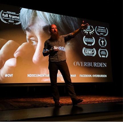 Chad A. Stevens speaks to the audience a screening of “Overburden” in Boulder, Colorado.